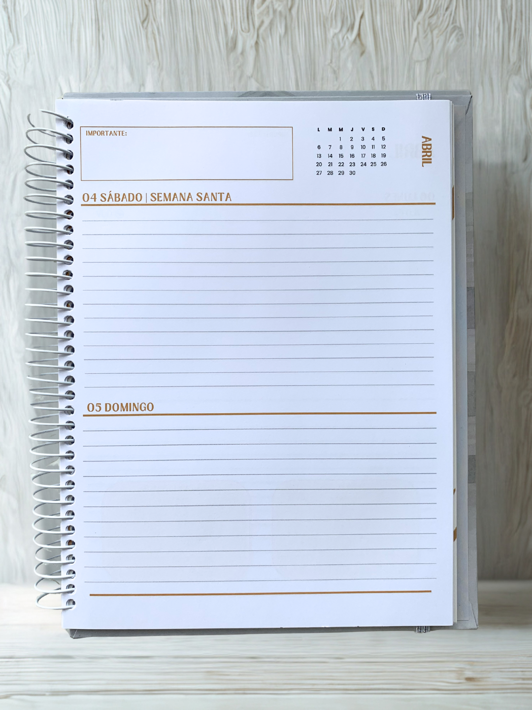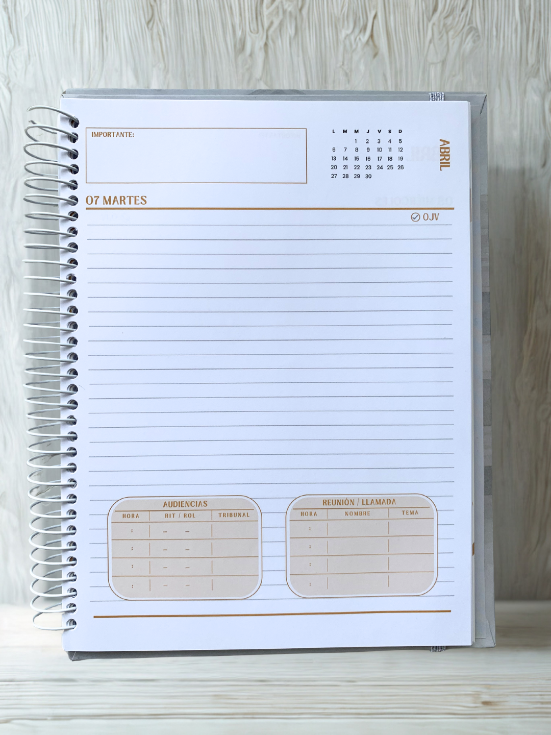 Incluye vista diaria de lunes a viernes, planificación mensual, widgets inteligentes para el registro de audiencias y reuniones, organización mensual de finanzas, secciones de notas, registros y metas, y un diseño limpio que aporta orden y claridad a tu día a día.